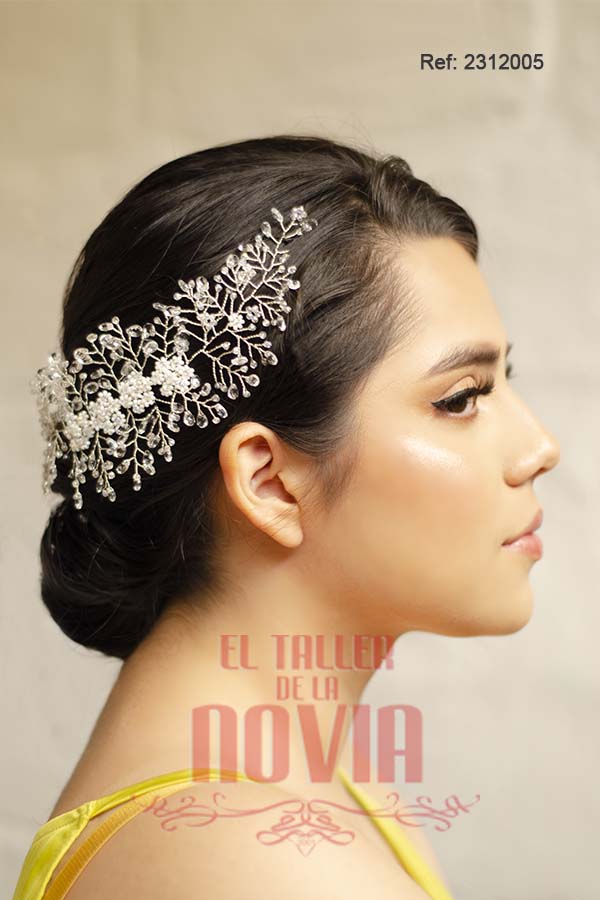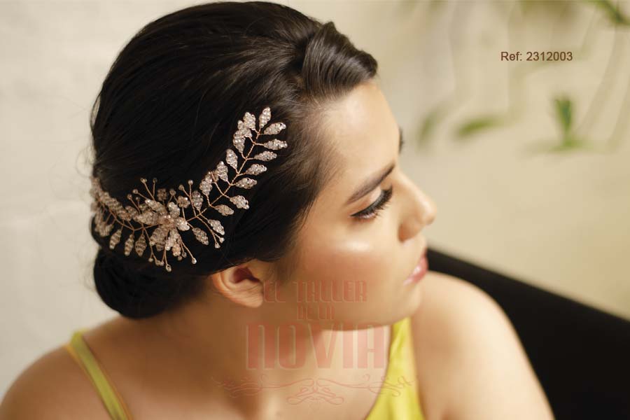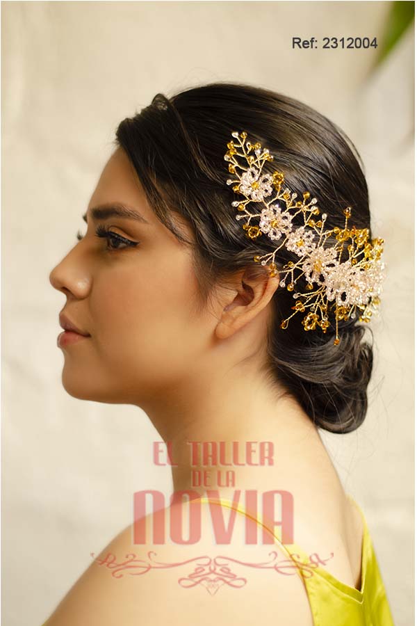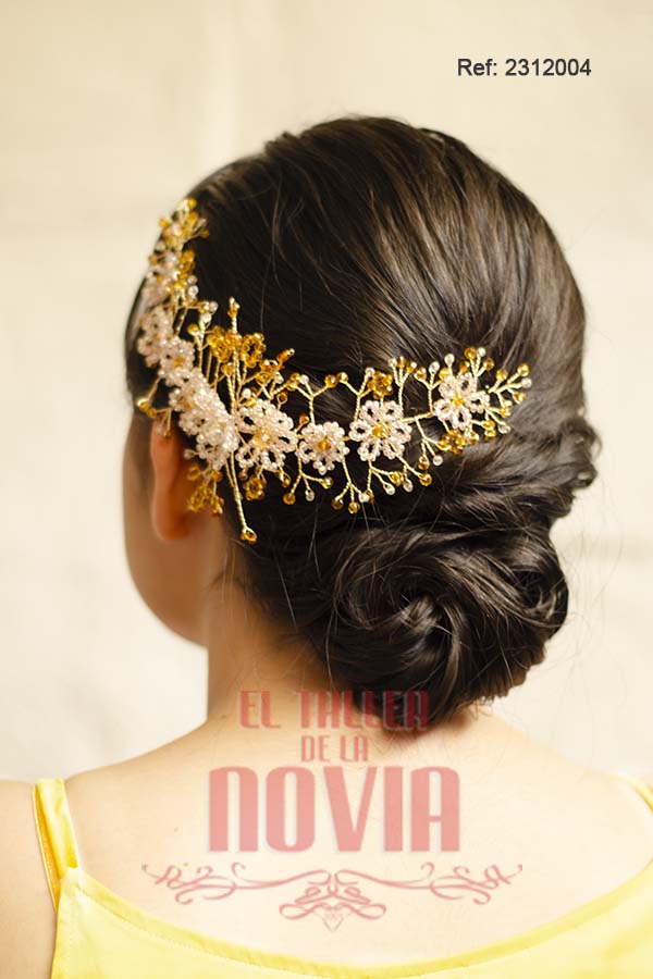Hermoso tocado de novia alambrismo color dorado, cristales dorados y flores cristal rosa pálido